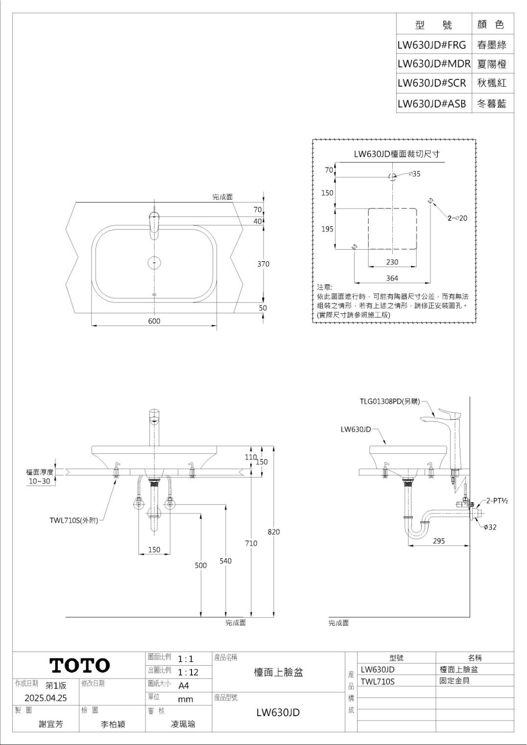 TOTO 檯面上臉盆 LW630JD (春墨綠/夏陽橙/秋楓紅/冬暮藍)