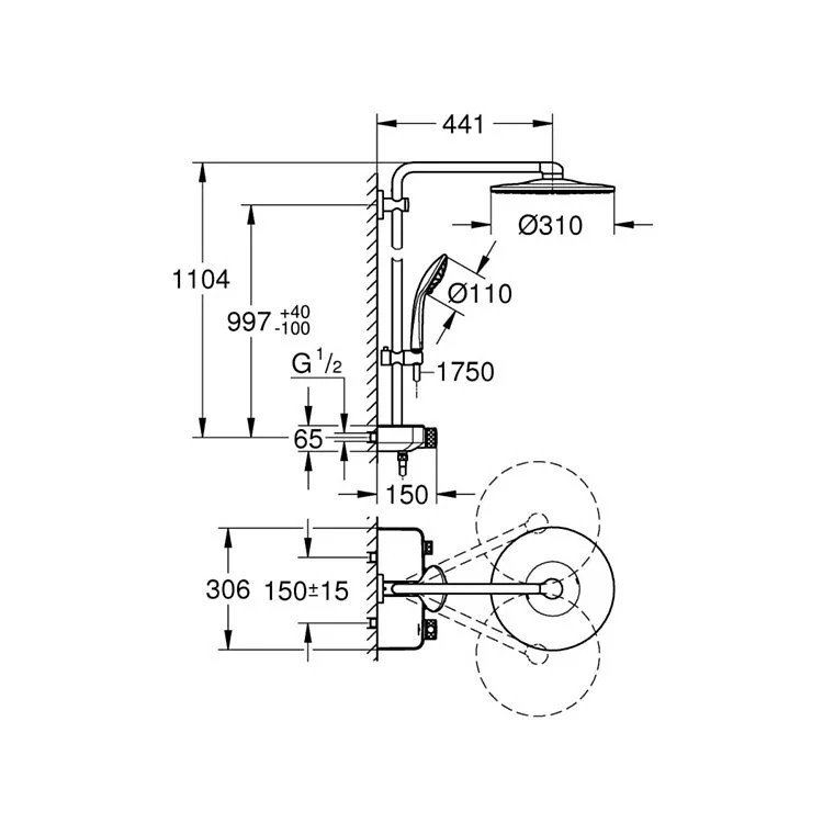 產品規格 ▪ Ø310 mm單段頭灑、頭灑臂長441mm ▪ 1750 mm軟管、三段式蓮蓬頭 ▪ 圖片顏色僅供參考,請以實際產品顏色為主
