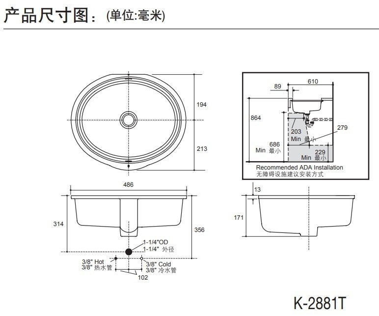 KOHLER Verticyl 下崁檯面盆 434x356mm / K-2881T-0