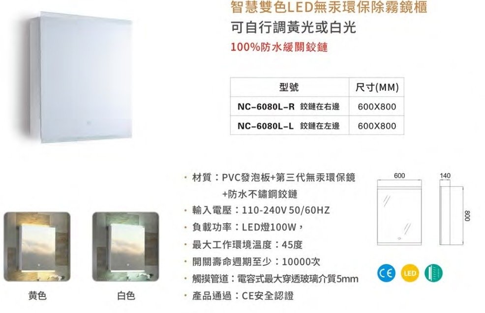 KARAT 智慧雙色LED無汞環保除霧鏡櫃 NC-6080