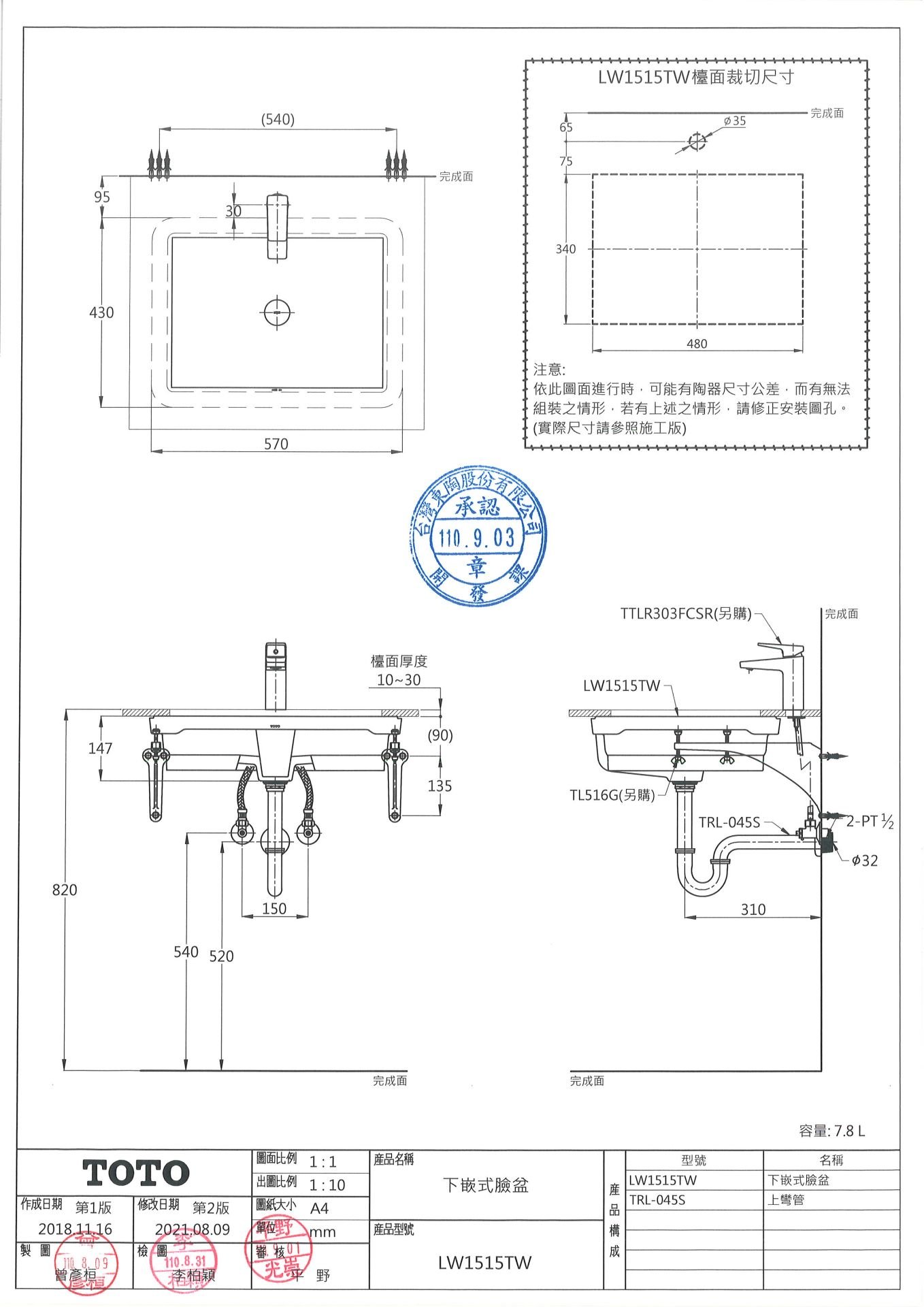 TOTO 下嵌式臉盆 LW1515TW 57CM