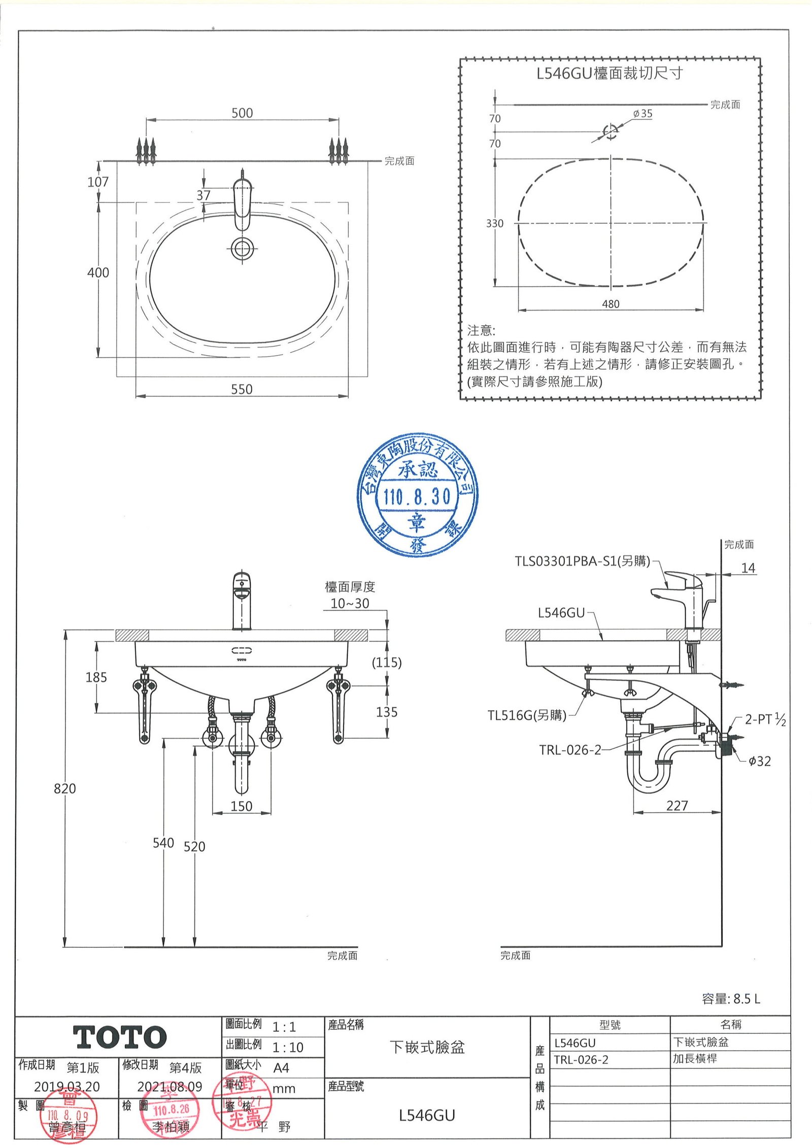 TOTO 下嵌式臉盆L546GU 55CM
